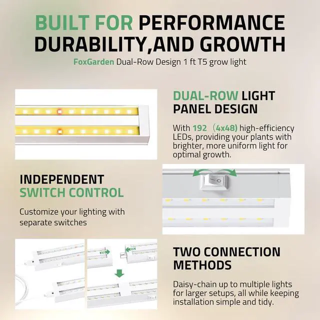 Individual Control and Daisy Chain Function for Custom Lighting Solutions Each grow light strip is equipped with an individual on/off switch, allowing you to customize the lighting for each plant. You can easily adjust the light to support healthier growth, extend bloom periods, and enhance fruit or seedling development. Additionally, the daisy chain function allows you to connect multiple lights in series, providing a convenient way to expand your lighting setup while maintaining individual control for each light.