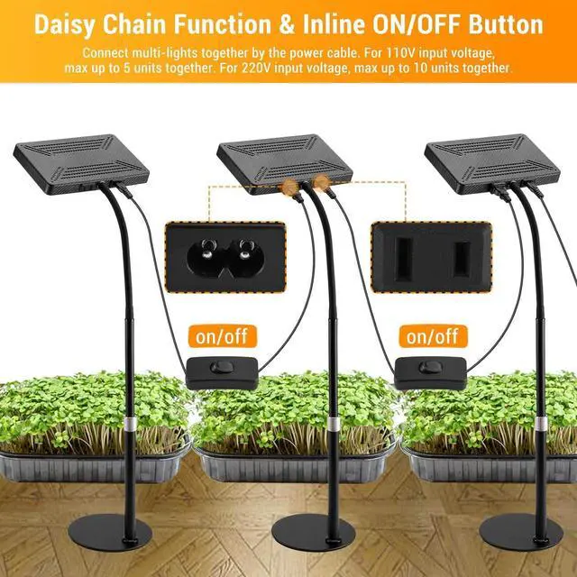 On/Off Switch & Daisy Chain FunctionThis desk grow lamp for indoor plants designed with an input plug and an output outlet. You can connect multi-lights max 4 units together by daisy chain function but only need one outlet.