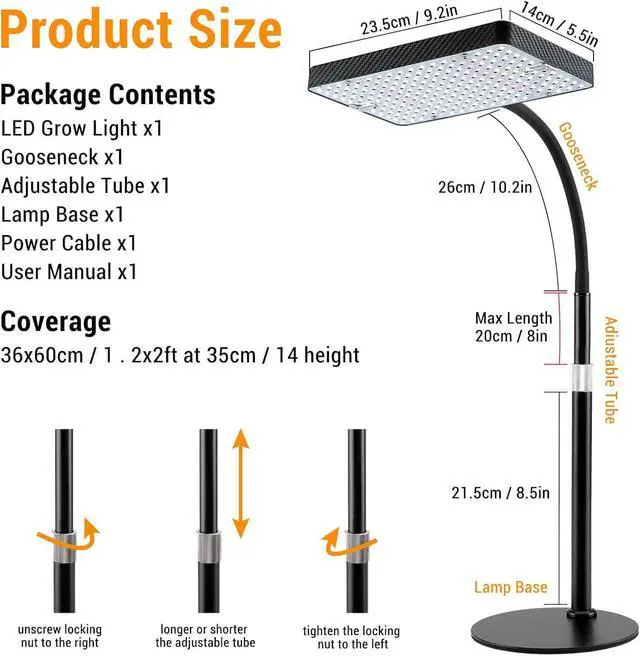 Stable Base and Adjustable Height StandThis desk grow light with base and stand, you can stand it on desk and adjust the lamp head height according to your application from 16 to 24.