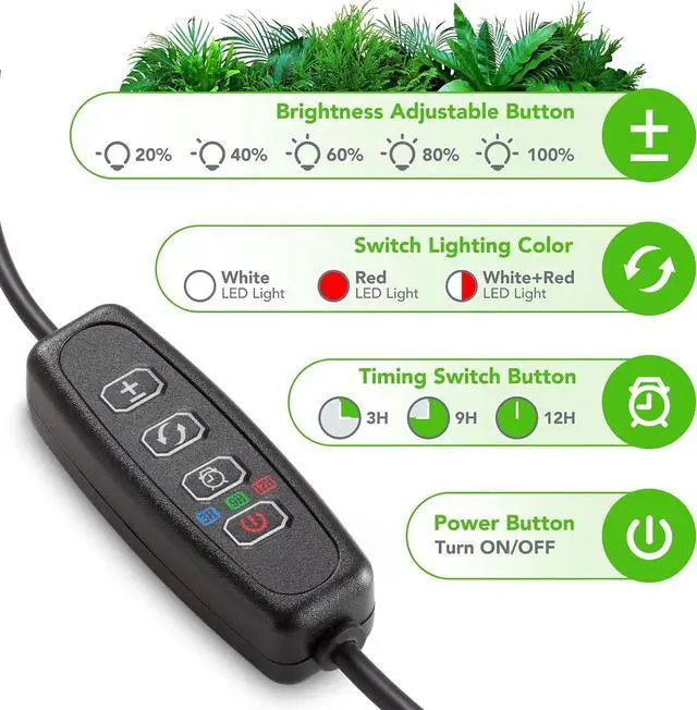 Smart Dimmable Controller with Memory ChipThe seedling start light offers the circular memory timer function with 3 options-3h/9h/12h and 5 levels of Dimming. When keeping power on, it can turn on and off automatically every day according to your settings, no more manual operation for you.