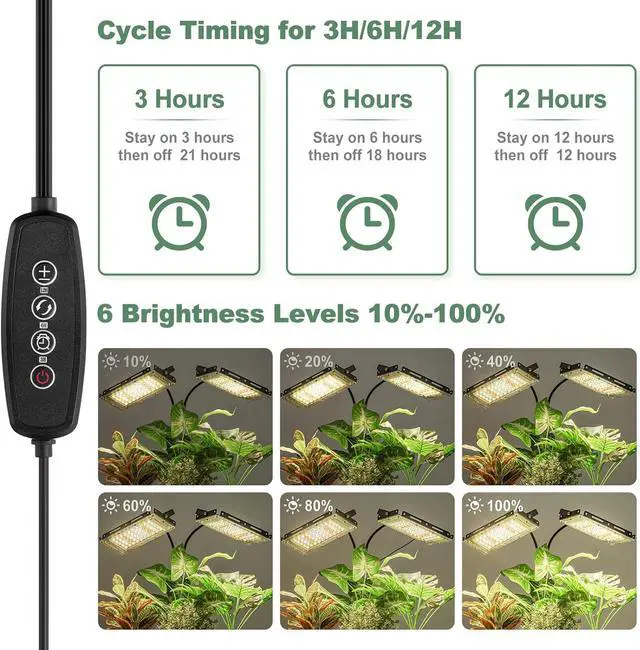 Auto on/off Timer: The timer controller of the growing light has an auto circular memory function, which can be set up to 3H/6H/12H. You can set it up once, and it will turn on at the same time everyday, allowing you to MIMIC SEASONS FOR SENSITIVE PLANTS, which is very convenient to operate.