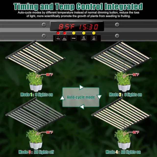 Temp Control and Timer Modes- Upgraded PT series with temp sensor, temp button and timer button. The light hanging height can be adjusted properly, plants will get more PPF value, no more electricity will be wasted. Auto setting Temp is 85; When temperature is up to 86 8 light bars on; When temperature is up to 91 6 light bars on; When temperature is up to 96 the light would be turned off.