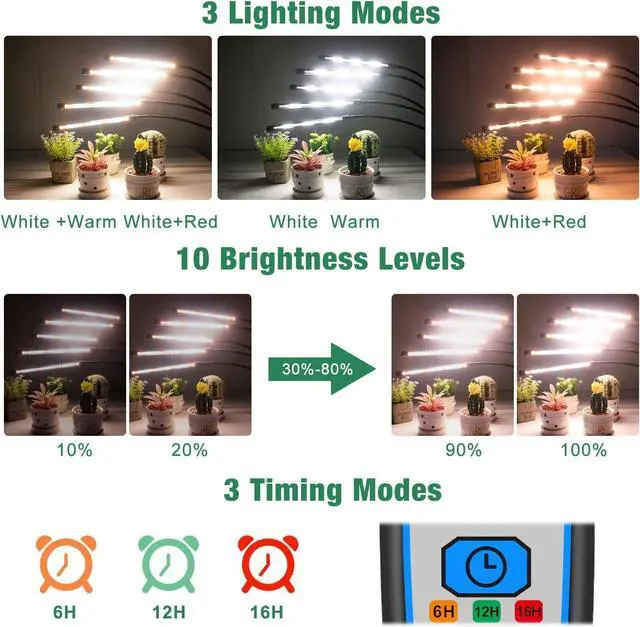 Upgraded Timer 6/12/16HThis grow light has a new upgraded timer, we can set the time to 6/12/16H. Through research, most plant lights on the market do not exceed 12 hours, 16H is more suitable for your plant growth. According to your setting, it will turn on and off automatically every day.