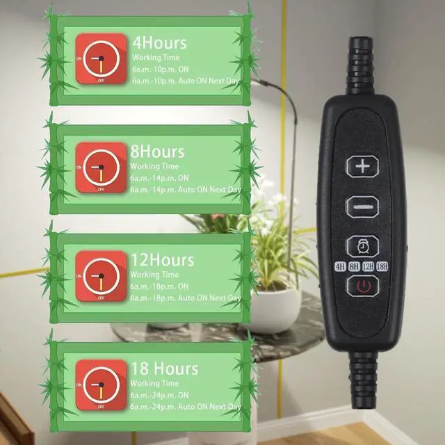 4/8/12/18Hrs Timer & Dimmable --- This small sun lamp for indoor plants offers 4 timer option - 4/8/12/18 Hrs, when kept plugging in, it will Auto ON/OFF, and no more manually operation everyday. Moreover, you can adjust the brightness according to your needs.