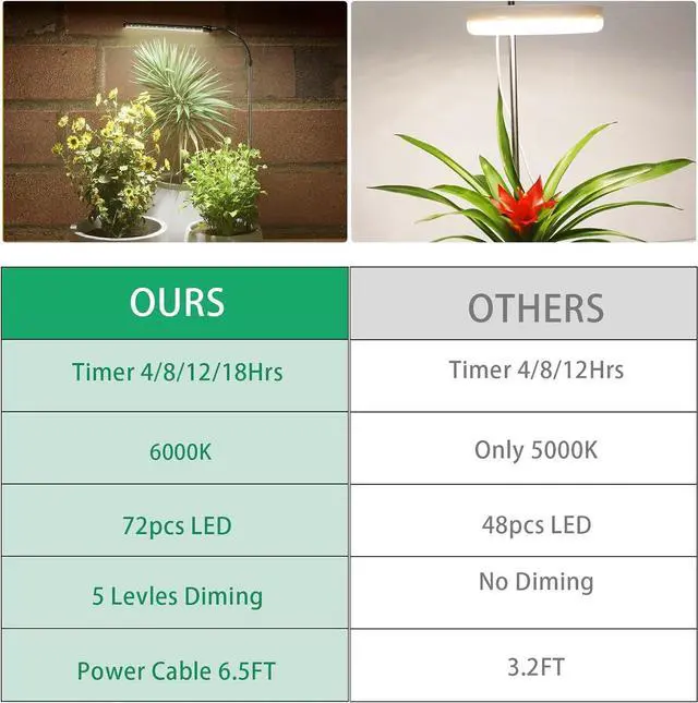 Upgraded High Efficiency Plant Light --- Equipped with 60pcs White & 12pcs Red super bright LED bulbs, which provides a 6000K full spectrum like sunlight to fuel plants growth, suitable for flowers, herbs, peppermint, succulents, seed starting, or any type of locations (hanging, trellis, floor, potted, bonsai plants).