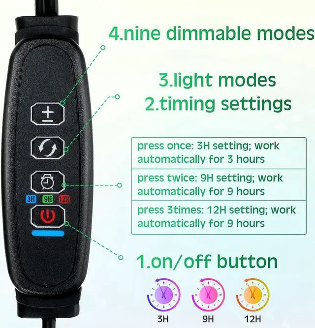 Timing Function: the LED plant light comes with circular memory timer function, which allows to automatically turn on/off every day according to your cycle timing settings (3/9/12 hours), with no manual operation, it will take good care of your plants every day