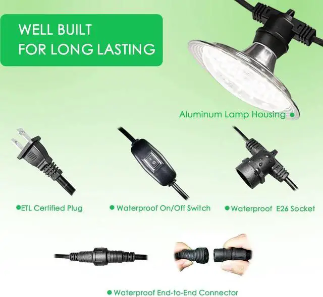 Durable & Long Lasting Waterpoof Grow LightThe aluminum housing bring this led grow light a good heat dissipation, and with a built-in auto-ranging power supply, our led grow light is applicable for 100-277VAC universal input voltage, and ensure stable light output. UL certified plug and cord for safe and long lasting use, E26 sockets and on/off switch for a convenient installation and daily use.