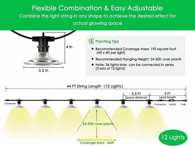 Waterproof and Linkable Grow Lights Outdoor You can link up 4 sets of this 12-lights plant grow string lights end to end, 540 watts Max. and have the free combination of these lights, which can be widely used for different growing space and growing stage, outdoor plant gardening greenhouse.