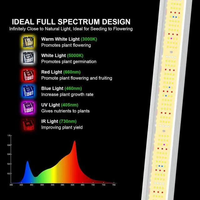IDEAL FULL SPECTRUM & DIMMING - AGLEX 240W grow lights for indoor plants consists of full spectrum Warm White3000K, Cool White 5000K, Blue 460nm, Red 660nm, UV 405nm and IR 730nm, is infinitely close to natural sun light, perfect for seeding to flowering, applied to the whole stages of indoor growing plant. Growing lamp 240w comes with flexible dimmable function, 4-level dimming knob from 0-100% available, the adjustable brightness feature is great for all stages of growth.