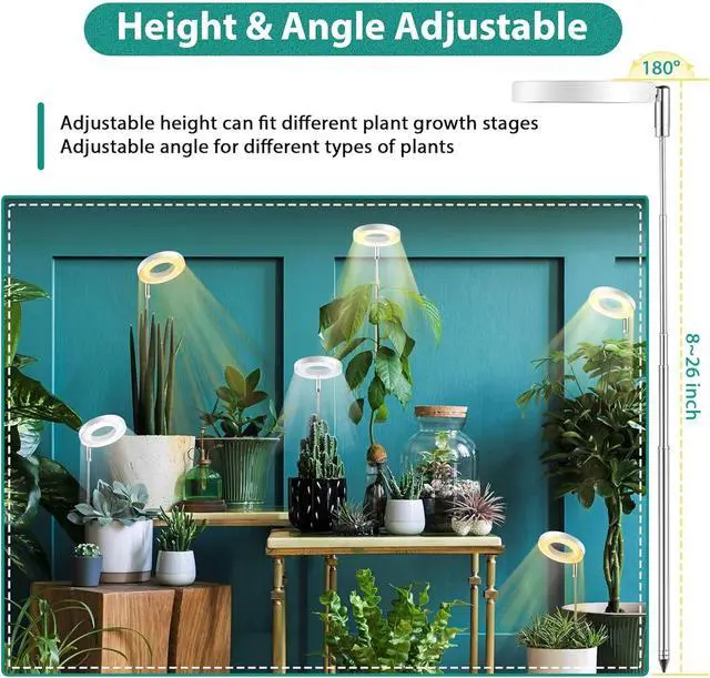 Easy Installation and Height AdjustableThis full spectrum LED light is very easy to install, just insert it into the potting soil and adjust the right height and angle; The height range of the growing light is 8 to 26 inch, accompany your plants from germination to flowering