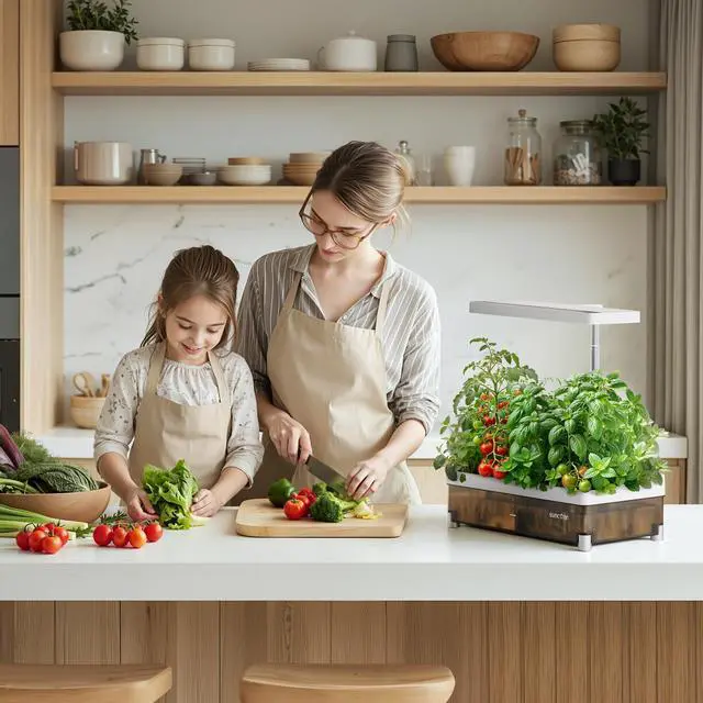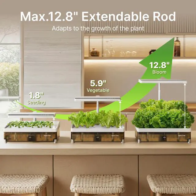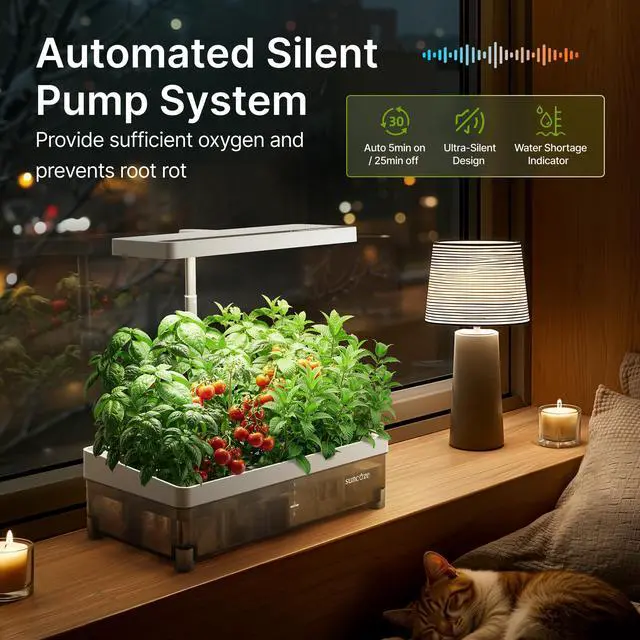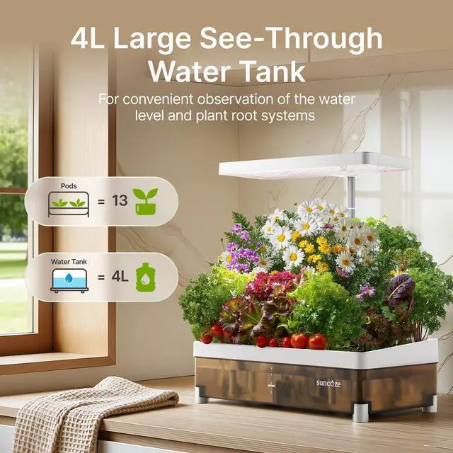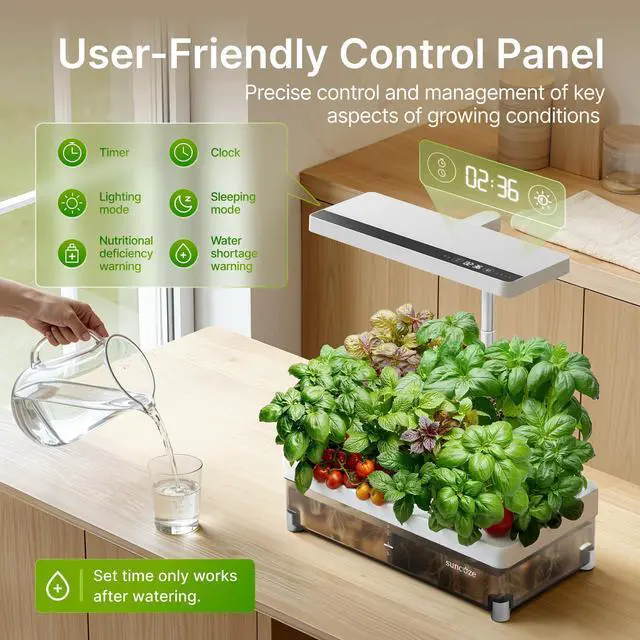 Bring nature into your home with the hydroponics growing systemdesigned for both plant lovers and modern living spaces. Inspired by light Japanese-style aesthetics, this indoor herb garden with grow light features a moon-white panel paired with a transparent coffee-colored water tank, creating a calm and cozy look that blends effortlessly with warm, natural home décor. The visible water tank allows you to easily monitor water levels at a glance, making daily care simple and stress-free. With space for up to 13 plants, this compact yet productive hydroponics growing system is ideal for growing herbs, leafy greens, and small vegetables without taking up too much counter space. Equipped with a dimmable 24W LED grow light, the system offers four adjustable brightness levels so you can customize light intensity based on plant growth stages and surrounding ambient light. The height-adjustable light pole (1.8"12.8") ensures even light coverage from germination to harvest, supporting healthy and consistent plant growth. An intuitive LED digital control screen allows you to set the local time and schedule when the grow light turns on. Smart reminders clearly notify you when water levels are low or when its time to add nutrients, making this indoor herb garden especially beginner-friendly. The built-in quiet water pump runs in automatic cycles, helping deliver oxygen efficiently while maintaining a peaceful home environment. This hydroponics growing system kit comes complete with planting baskets, planting sponges, transparent humidity domes, and A&B nutrientseverything you need to get started, except seeds. Whether youre new to indoor gardening or looking for a thoughtful gift, the IG1009 is a practical and stylish gardening gift that brings greenery, calm, and everyday joy into any home.