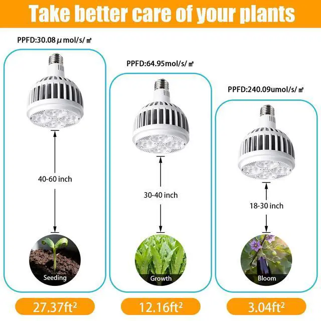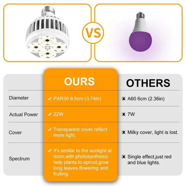 High PPFD & Energy SavingSmaller focal length enhances light intensity, resulting in higher PPFD for better light absorption. 22W low power consumption reduces electricity costs, being energy-saving and eco-friendly.