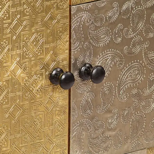 This cabinet is made of solid acacia wood with a subtle honey finish, which gives it a beautiful look and warm color. The beautiful, decorative metal details in different color tones, as well as the antique-style handles, endow this wooden cabinet with a touch of luxurious charm. High quality craftsmanship and beautiful wood grains make every piece of furniture unique and slightly different from the next. This cupboard features 2 cabinets with doors, which provide ample storage space for your clothing, books, and various other items.