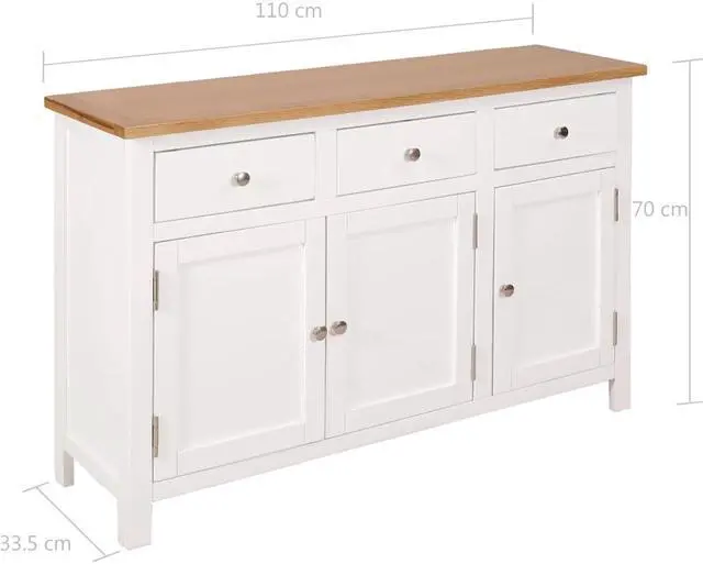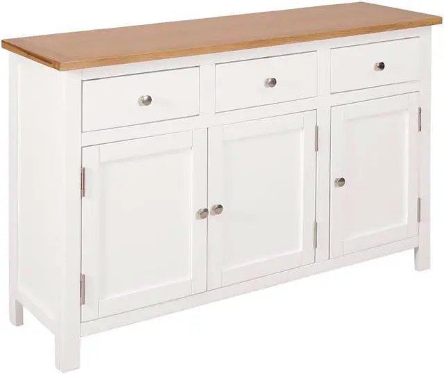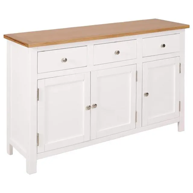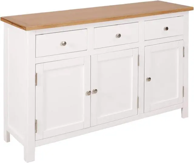 This sideboard has been expertly crafted from durable solid oak and acacia wood. The clean edges and the polished metal knobs add to its modern country style. The rectangular top is ideal for placing a telephone or displaying decorative objects such as photo frames or potted plants. The three drawers and two cabinets provide ample space to store kitchenware in your kitchen or paperwork in your study.