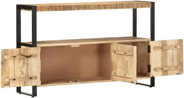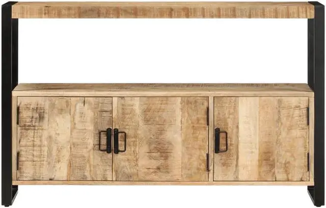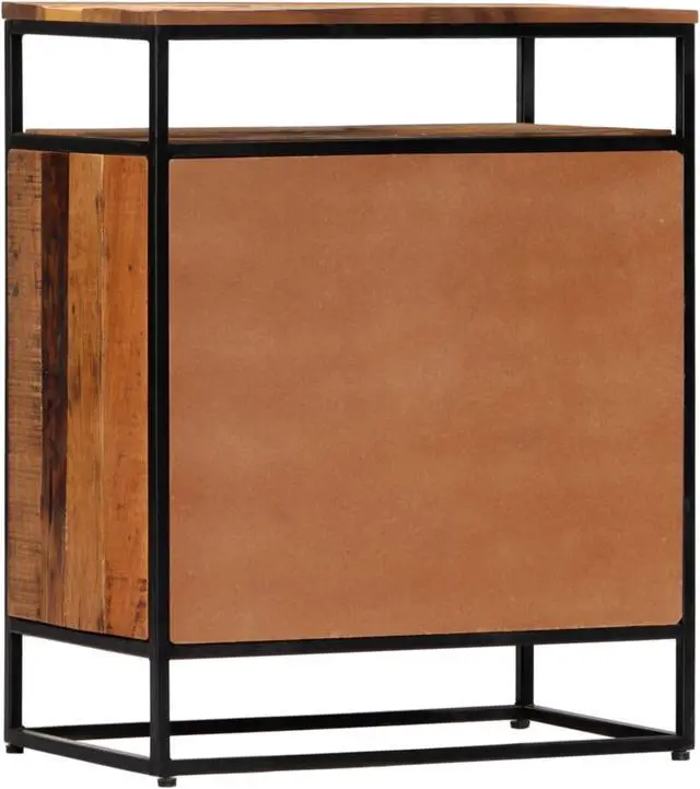 This sideboard is made of solid reclaimed wood that has been sourced from joists, floors and support beams from old buildings being demolished, and it can consist of different types of wood like pine, teak, beech, oak, cedar, mango wood, acacia, etc. This means the reclaimed wood retains the characteristics of these different types of wood. Reclaimed wood is already aged, weathered and dried, so it doesn't shrink or bend. Every step of the process is carried out with the greatest care, be it polishing, painting or lacquering. The exquisite craftsmanship and the graceful wood grains make every piece of furniture distinctive and slightly different from the next. This side cabinet is distinguished by 2 doors and 1 shelf, offering an ideal solution for keeping your smaller items organized and within reach. Additionally, the powder-coated steel frame adds to the cabinet's sturdiness and stability. The side cabinet is easy to assemble.