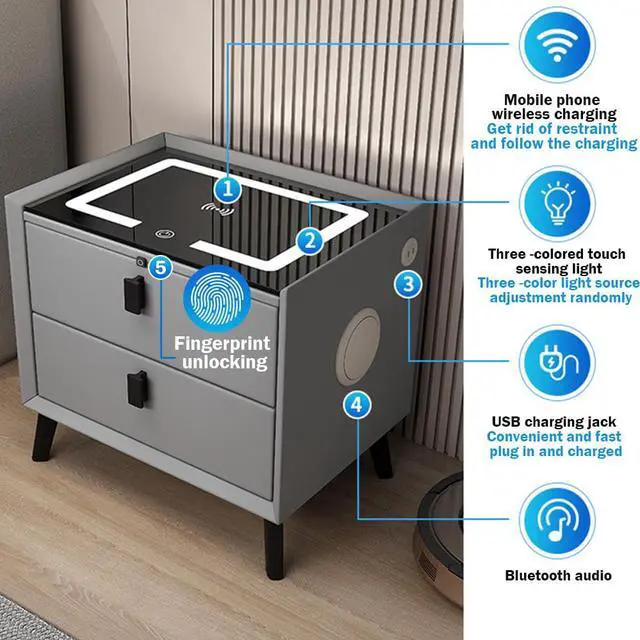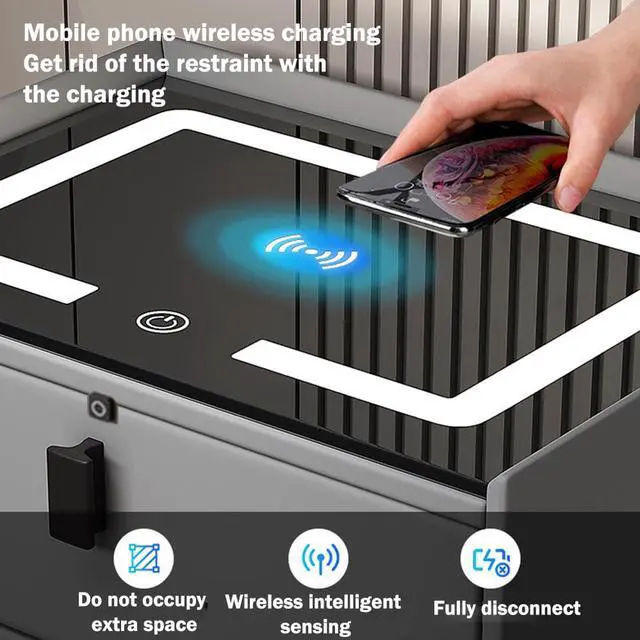 This bedside table has a multi-functional intelligent design. The mobile phone can be charged wirelessly. There is a USB double hole socket on the side, which can meet the charging needs of three mobile phones at the same time. It can be charged quickly. The table top is equipped with LED three color induction light, which can be converted into three gears