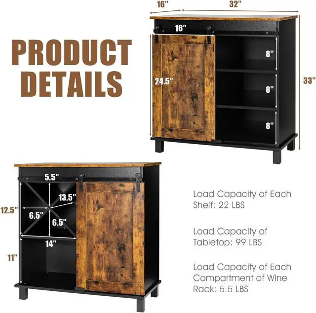 Easy to Assemble and Maintain: All required accessories and detailed user manual help you to assemble this cabinet quickly and easily. Thanks to its simple construction, you can maintain it without effort. The dimension of this buffet cabinet is 32" x 16" x 33"(L x W x H). And the size of its sliding barn door is 16" x 24.5"(L x W).