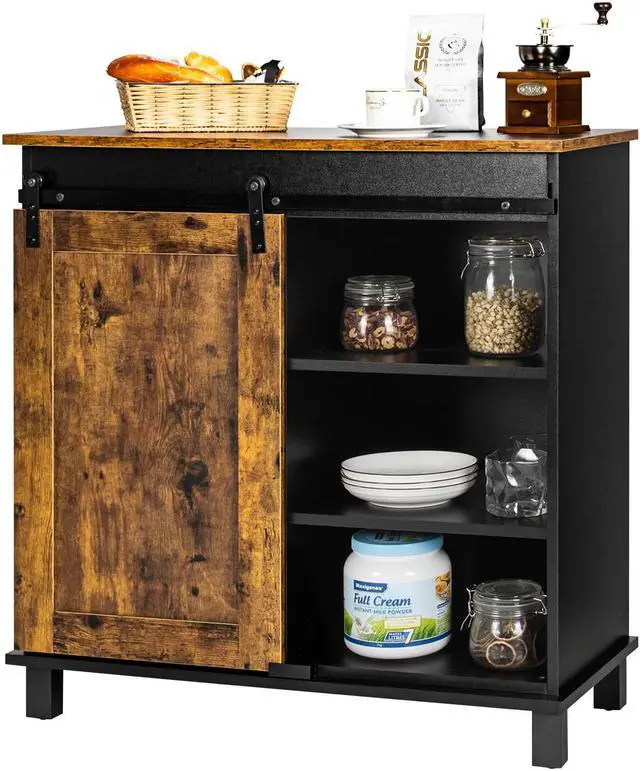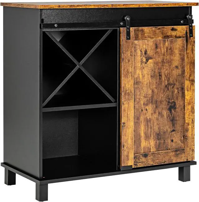 Different Storage Space: This industrial buffet cabinet is specially designed differently on both sides. When you slide the barn door to the left, there is a storage cabinet with 3 tiers shelves. When you slide the barn door to the right, there is a wine bottle organizer and a open storage cabinet.