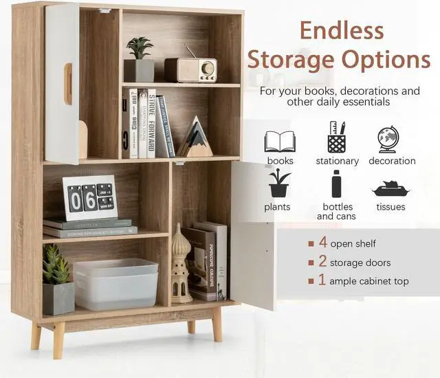 Endless Storage Options: This 4-tier accent storage cabinet features 2 storage doors for hiding the mess and 4 open shelves for displaying your book collection and decorations. A medium height allows you to place photos, plants, and other daily essential items on the cabinet top.