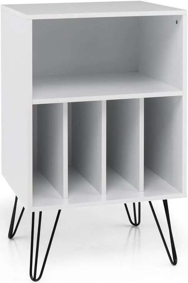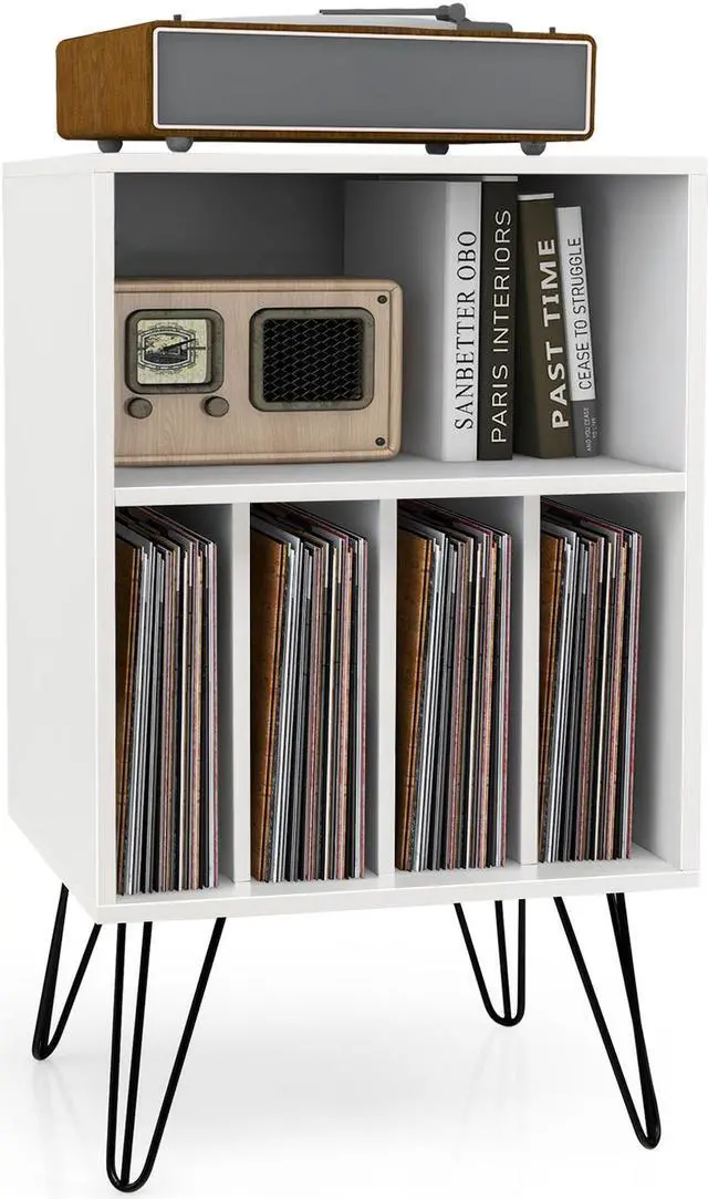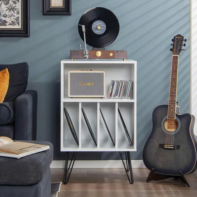 Enough Storage Space: This turntable stand comes with 5 open compartments for storing various kinds of albums. With two different size of 4.5" (L) x 18" (W) x 13" (H) and 21" (L) x 18" (W) x 10" (H), the vinyl records fit perfectly in the bottom shelves while the speakers can be stored in the large cubby. Moreover, the cabinet top is a perfect platform to place your record player.