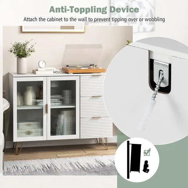 Stable and Reliable Design: This freestanding bar cabinet is made from thick and durable boards for long term use. It is supported by robust metal legs, providing excellent stability and durability. Equipped with anti-toppling device, the cabinet can be attached to the wall to prevent from tipping over.