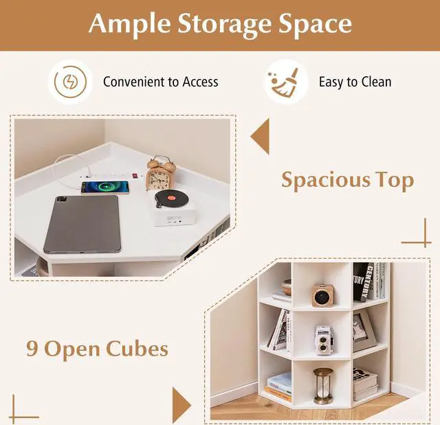 9 Cubbies for Varied Sundries: Coming with 1 spacious top and 9 open cubes, our corner cabinet provides ample storage space and is convenient to access. You can use it to store, books, toys, collections, tableware or office supplies. It will serve as a bookshelf, a toy storage or a nightstand to make your life well organized.