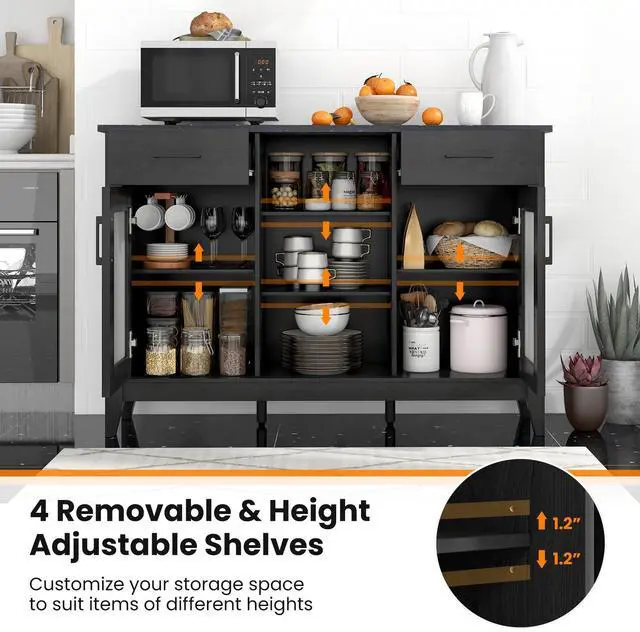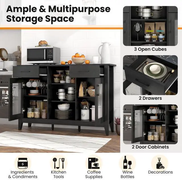 Ample Storage Space: With its 3 open cubes, 2 drawers, 2 door cabinets, and 4 adjustable shelves, the sideboard cabinet neatly holds your ingredients, condiments, kitchen tools, coffee supplies, or wine bottles. In addition, the extended tabletop makes an ideal spot for your home appliances or decorations.