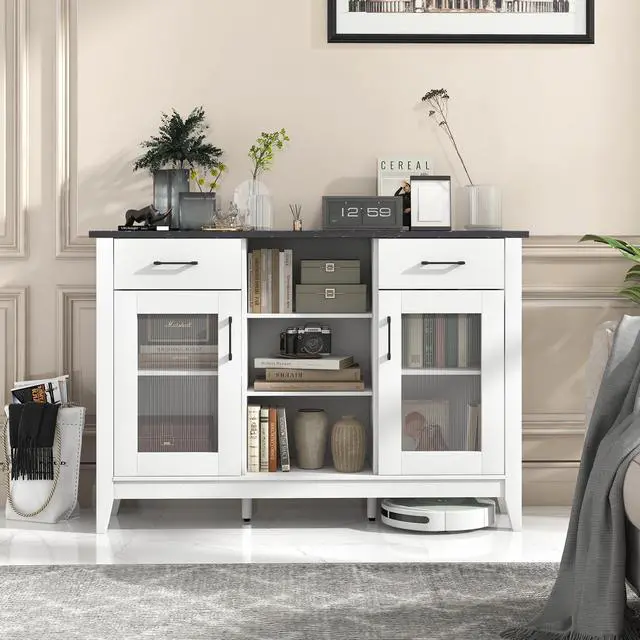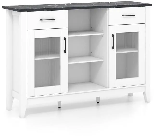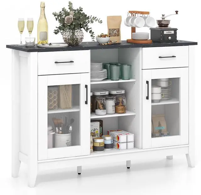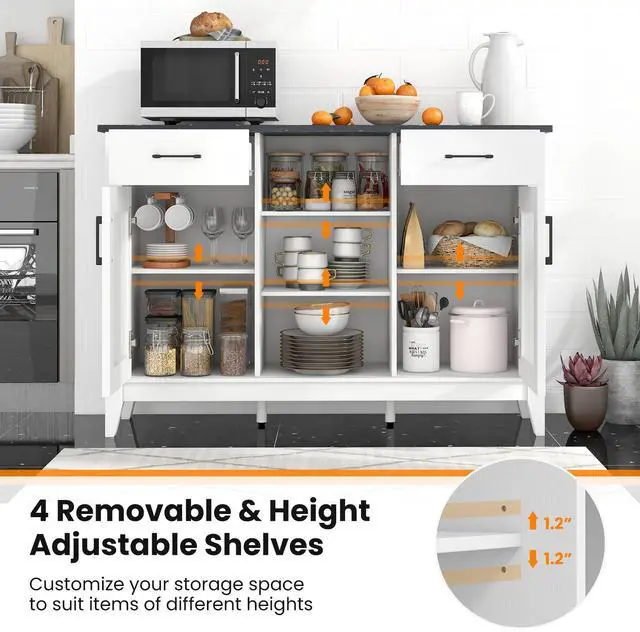 Ample Storage Space: With its 3 open cubes, 2 drawers, 2 door cabinets, and 4 adjustable shelves, the sideboard cabinet neatly holds your ingredients, condiments, kitchen tools, coffee supplies, or wine bottles. In addition, the extended tabletop makes an ideal spot for your home appliances or decorations.