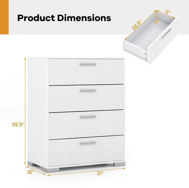 Ample Storage Space:/b> This tall dresser comes with 4 deep drawers, each measuring a generous 28.5L x 11W x 5D for neatly organizing your sundries and daily necessities. Its spacious top provides a handy space for plants, decorations and photo frames. Product Dimensions: 31L x 18W x 39.5H.