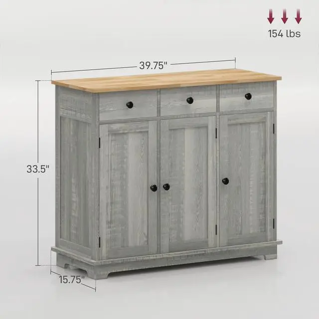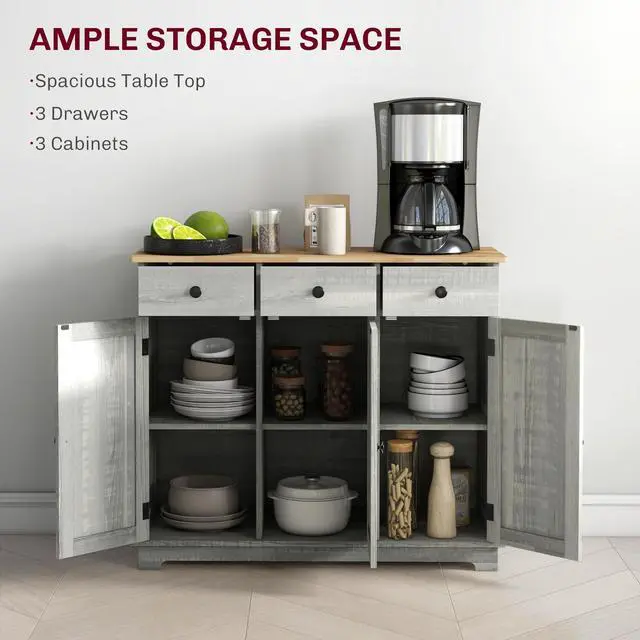 Roomy Storage: This buffet cabinet utilizes 3 large drawers for utensils or napkins and 2-tiers offering storage space for plates, plastic containers, pots, or pans. Keep organized behind doors so your items stay safe and dust-free. The shelf inside is 3-level adjustable to meet various storage needs.