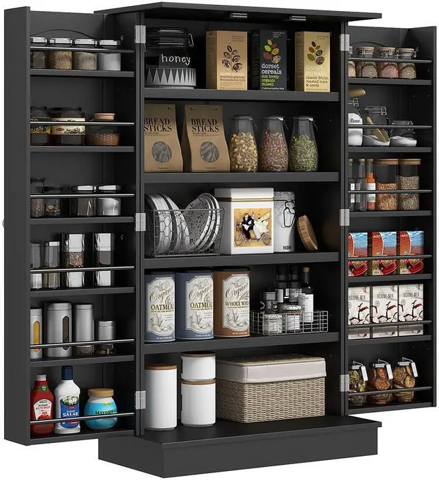 Upgrade Your Storage: Featuring 5-tier interior shelving and 12-tier side racks behind the doors, this pantry cabinet gives you plenty of room for dishes, cookbooks, pots and pans, spice jars. Meanwhile, the side racks are designed with bars to prevent items from falling over. If you have taller items, the adjustable shelves can be customized to fit items like pitchers, pasta containers and blenders.