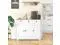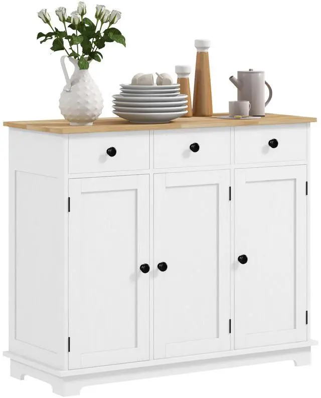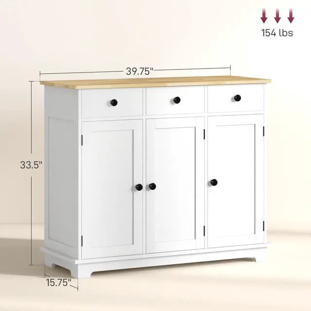 • Sideboard with Solid Wood Countertop, Modern Kitchen Storage Cabinet, Coffee Bar Cabinet with 3 Drawers, Doors and Adjustable Shelf, Distressed White