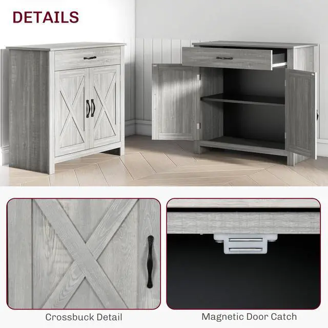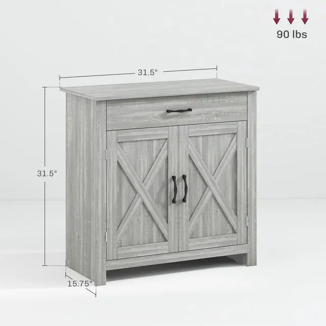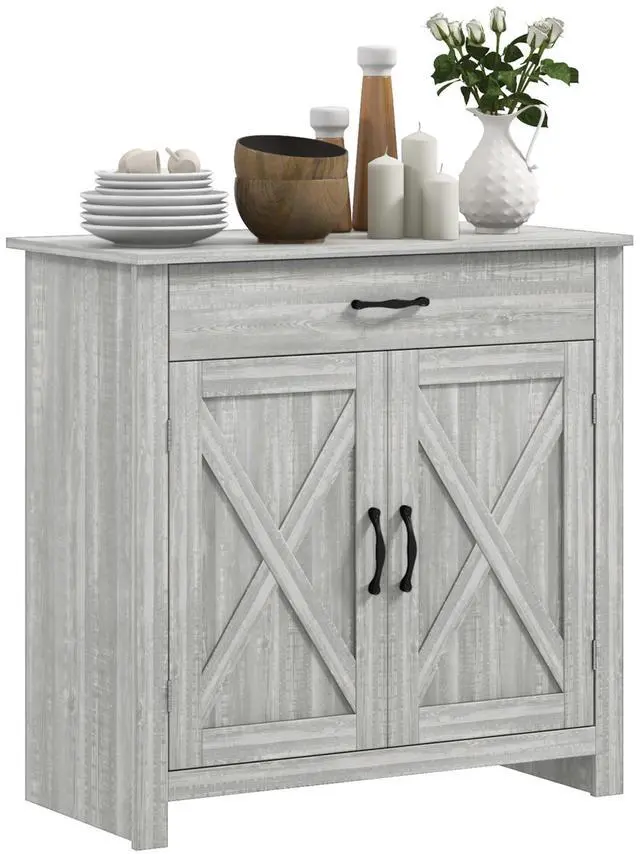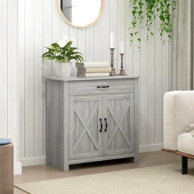 Farmhouse Appeal: Bring rustic elegance into your home with our charming sideboard cabinet featuring beautiful barn doors, distressed wood finish and antique black handles, creating a great blend of style and functionality for any space.