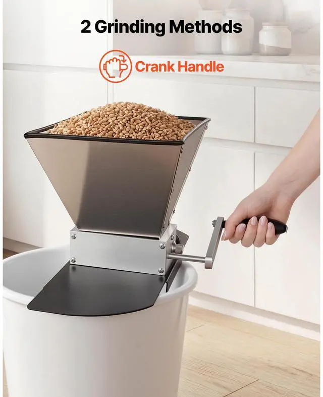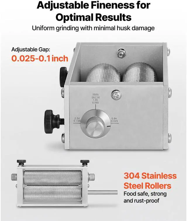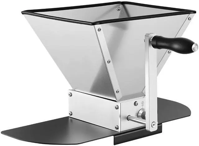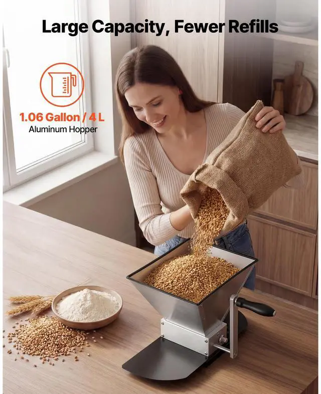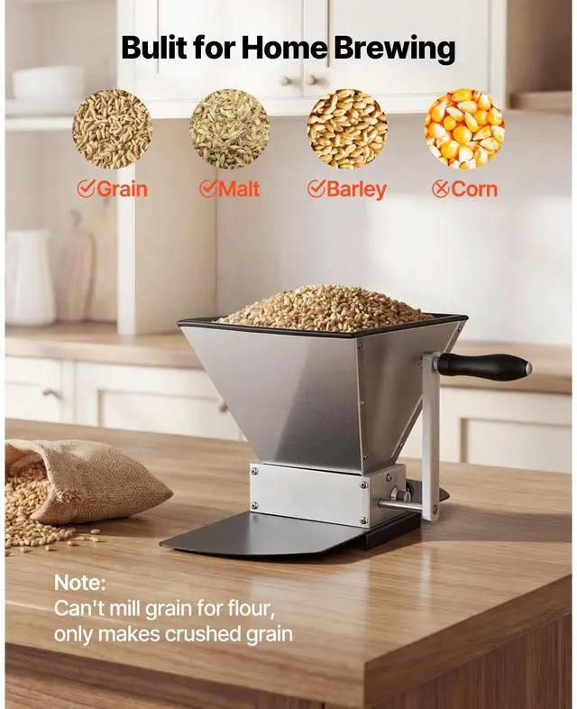 VEVOR Manual Grain Mill, Homebrew Malt Grinder, Adjustable Barley Mill Crusher for Wheat Beer Brewing - with 2 Stainless Steel Rollers, 1.06 Gallon Hopper & Metal Base Plate