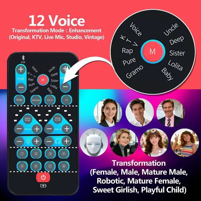 12 Voice Transformation ModeThis voice changer features 2 main modes: Enhancement (Original, KTV, Live Mic, Studio, Vintage) to refine tone, and Transformation (Female, Male, Mature Male, Robotic, Mature Female, Sweet Girlish, Playful Child) for dramatic shifts. Both Female/Male voices offer 7 adjustable fine-perfect for roleplay, humor, calls, streams, or gaming