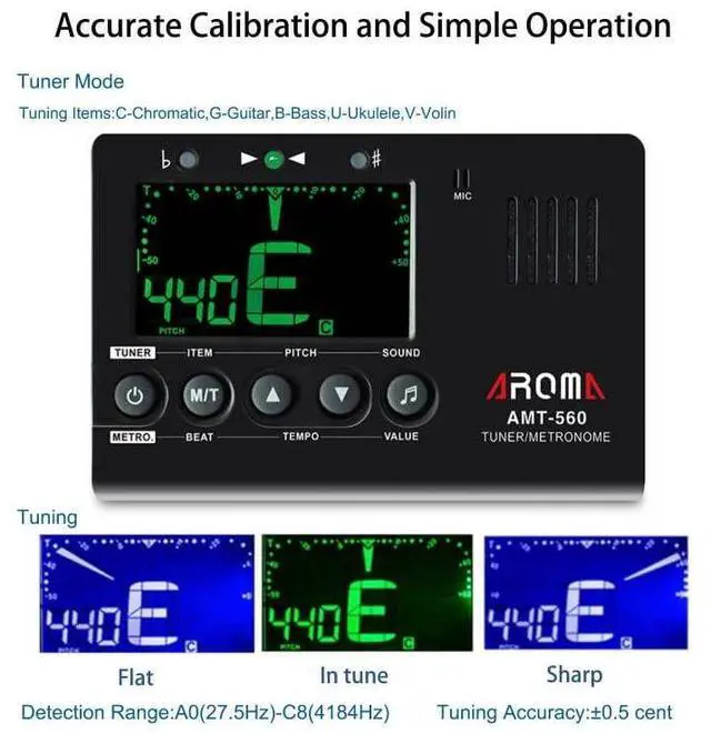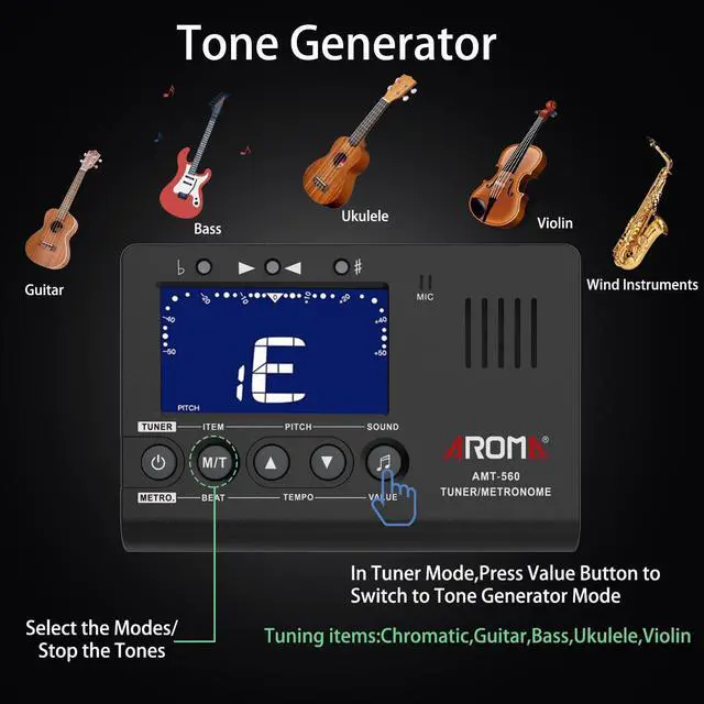 - There are sound for Chromatic, Guitar, Bass, Ukulele, Violin. Press the button ITEM to select the needed mode for your instrument and press the button SOUND to select the needed sound. Ref: C(Chromatic), G(Guitar), B(Bass), U(Ukulele), V(Violin).