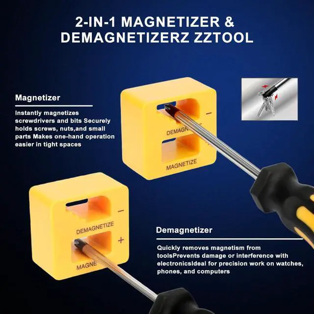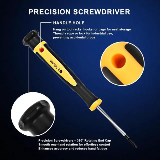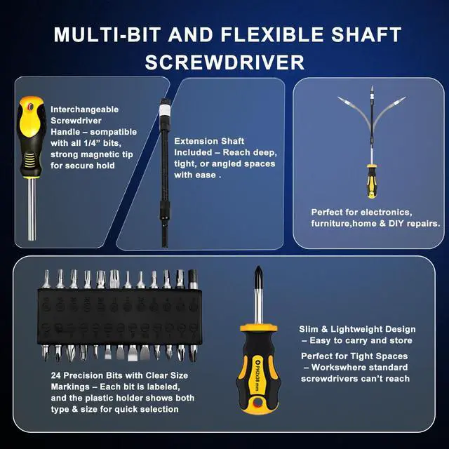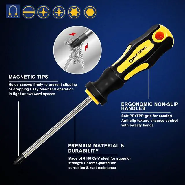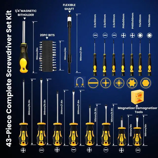 The 43-Piece Magnetic Screwdriver Set is a professional-grade tool kit designed for durability, versatility, and convenience. Each screwdriver bar is crafted from premium 6150 chromium vanadium steel, tougher than standard Cr-V or carbon steel, and chrome plated for rust resistance and long-lasting performance. This complete screwdriver set kit includes 8 full-size screwdrivers, 7 precision screwdrivers, and a 25-piece 1/4 screwdriver bit set with Phillips, Slotted, Torx, Hex, and Pozidriv tips. It also comes with a flexible extension shaft, magnetic bit holder, and magnetizer/demagnetizer tool, with all bits compatible with electric screwdrivers and drills. The magnetizer/demagnetizer allows you to easily add or remove magnetism, making it simple to handle small screws in electronics or avoid interference in sensitive devices. The flexible extension shaft helps reach tight and angled spaces with ease. Designed for comfort, the non-slip PP+TPR handles provide maximum grip and torque, while precision screwdrivers feature 360° swivel caps for smooth, controlled operation. All tools are neatly organized in a durable storage case with custom-molded slots, ensuring no pieces get lost. This versatile magnetic screwdriver set with case is ideal for home improvement, furniture assembly, computer repair, watch and jewelry fixing, and even small automotive projects.