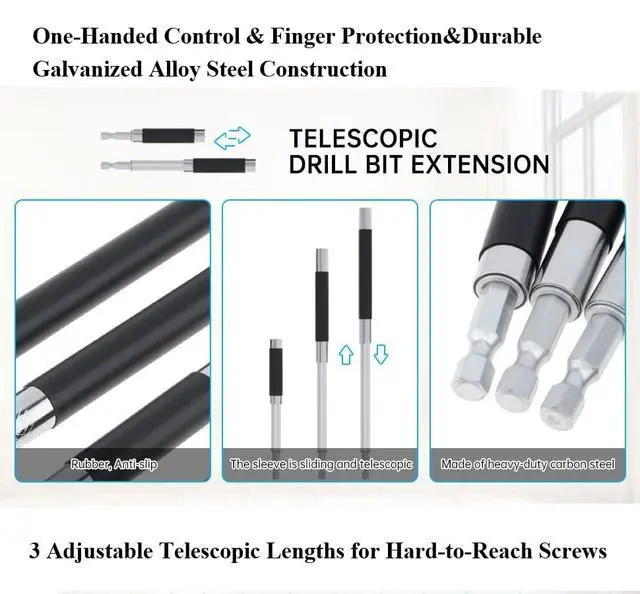 Telescopic Adjustable Design:Three sizes (3.1"–4.6", 4.7"–7.8", 5.5"–9.4") with telescopic reach. Effortlessly handle screws in deep or narrow spaces without changing tools.