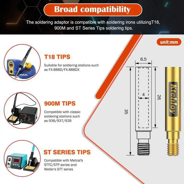 Versatile Compatibility for Soldering Irons: This soldering adaptor seamlessly compatible with soldering irons utilizing T18 900M and Weller ST series soldering tips, including models like Hakko FX-888D, FX-888, FX-8801, FX-600, Weller WLC100, SPG40, SP40NUS, SP40L, SP40N, Yihua 926, 939D, and more.