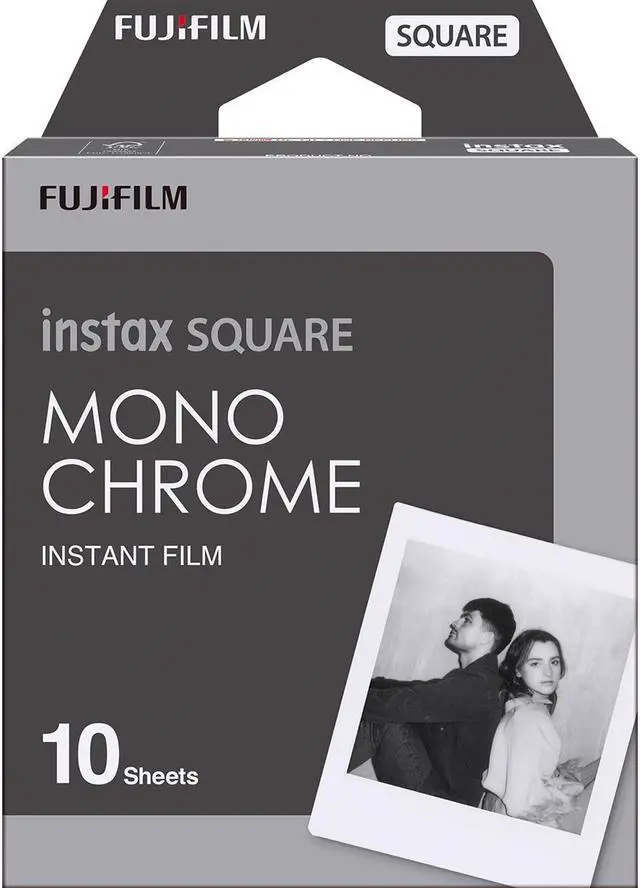 This single pack of FUJIFILM INSTAX Square Monochrome Instant Film contains 10 sheets of instant black & white film that is compatible for use with the FUJIFILM INSTAX Square series of cameras or INSTAX Square printers. This film features neutral gray tonality and normal contrast with natural shadow and highlight response when used under daylight or electronic flash lighting conditions. A refined grain structure provides high image sharpness and clarity as well as a versatile ISO 800 film speed for use with a wide variety of subjects. Each sheet of film produces a glossy image that is surrounded by a simple white border.