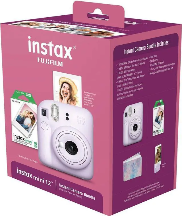 Begin your photographic adventure and share your cherished moments with the INSTAX MINI 12 Instant Film Holiday Camera Bundle. This comprehensive package features a user-friendly lilac purple instant film camera, a 10-pack of instant film, an elegant photo album capable of storing 32 INSTAX MINI photos, and a magnetic Love photo holder. Additionally, you'll receive an INSTAX DIY Idea Booklet for creative inspiration and tips on maximizing your INSTAX camera's potential.