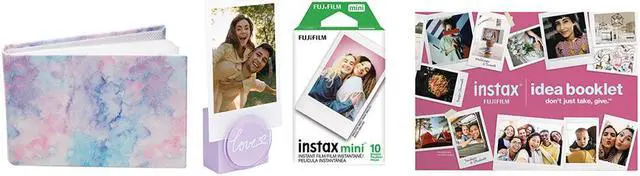 • Compact and cute design. Easily twist the lens to turn on and off. Built-in selfie mirror for easy selfies Close-up mode with parallax correction. Features automatic exposure and flash control for bright photos that are not washed-out. Prints out high-quality, 2 x 3 INSTAX MINI instant photos in approximately five seconds (Development time thereafter is approximately 90 seconds).. Bundle Includes: 10pk Instax Mini instant print film, Instax Mini Photo Album - holds 32 Instax Mini photos, Instax "Love" Photo Holder with magnet - holds 1 Instax photo, and Instax Photo Idea Booklet outlining creative projects that can be created using printed Instax photos. Also Included: Hand strap, user manual, (2) AA batteries and 1-year limited warranty