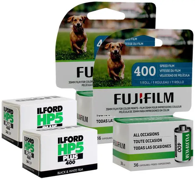 2X ILFORD HP5 PLUS BLACK AND WHITE NEGATIVE FILM (35MM ROLL FILM, 36 EXPOSURES) + 2X FUJIFILM 400 COLOR NEGATIVE FILM (35MM ROLL FILM, 36 EXPOSURES) FUJIFILM 400 Color Negative Film (35mm Roll Film, 36 Exposures)FUJIFILM 400 Color Negative is a high-speed, daylight-balanced, 35mm color negative film offering a wide exposure latitude for greater versatility as well as a fine grain structure with consistent and accurate colors. With a nominal sensitivity of 400 ISO, this versatile stock can serve a multitude of applications under a wide range of lighting conditions. From sun-drenched vacation snaps to a flash-lit night scene, this color film is designed to produce quality prints.