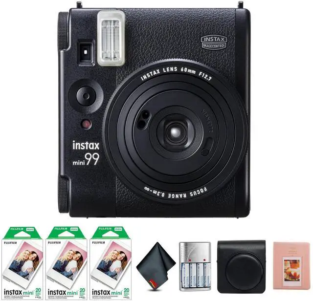 Bundle includes: FUJIFILM INSTAX MINI 99 Instant Film CameraGeneric Bag for Fujifilm Instax Mini99 with Shoulder Strap BlackDiginerds Microfiber Cleaning ClothPack of 3 Fujifilm Instax Mini Instant Film Twin Pack (White), 60 Photos64 Pockets 3 Inch Photo Album (Color May Vary)