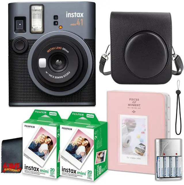 Bundle Includes: FUJIFILM INSTAX MINI 41 Instant Film CameraDiginerds Microfiber Cleaning ClothPack of 2 Fujifilm Instax Mini Instant Film Twin Pack (White), 40 Photos4x AA Rechargeable Batteries with Charger Generic Bag for Fujifilm Instax Mini 41- Black64 Pockets 3 Inch Photo Album (Color May Vary)