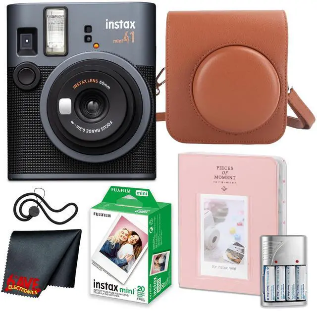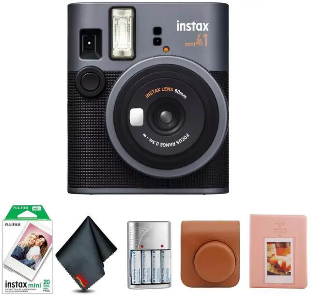 Bundle Includes: FUJIFILM INSTAX MINI 41 Instant Film CameraDiginerds Microfiber Cleaning ClothFujifilm Instax Mini Instant Film Twin Pack (White), 20 Photos4x AA Rechargeable Batteries with Charger Generic Bag for Fujifilm Instax Mini 41- Dark Khaki64 Pockets 3 Inch Photo Album (Color May Vary)