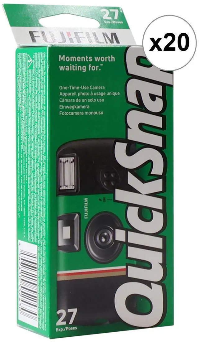 20X FUJIFILM QUICKSNAP FLASH 400 ONE-TIME-USE DISPOSABLE CAMERA (27 EXPOSURES) FUJIFILM QuickSnap Flash 400 One-Time-Use Disposable Camera (27 Exposures) A convenient one-time-use disposable camera for both indoor and outdoor shooting situations, the QuickSnap Flash 400 from FUJIFILM is loaded with a roll of 27-exposure Fujicolor Superia X-TRA 400 color negative film for bright, vivid results in a variety of lighting conditions. The compact, portable camera design incorporates a fixed-focus, wide-angle lens, and a matching optical viewfinder for making accurate compositions. Additionally, for image-making in low-light conditions, a built-in flash with a 10' range is featured. It offers automatic recharging, continuous flash operation, and manual on/off control.