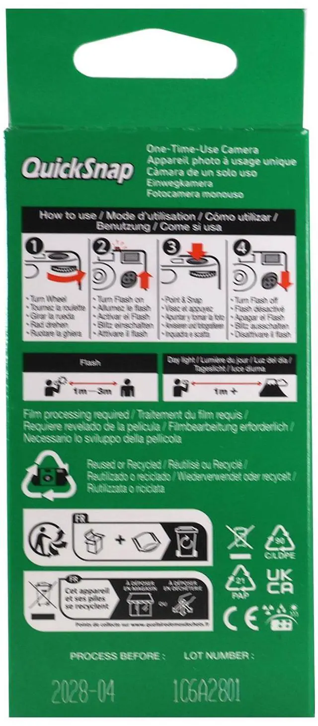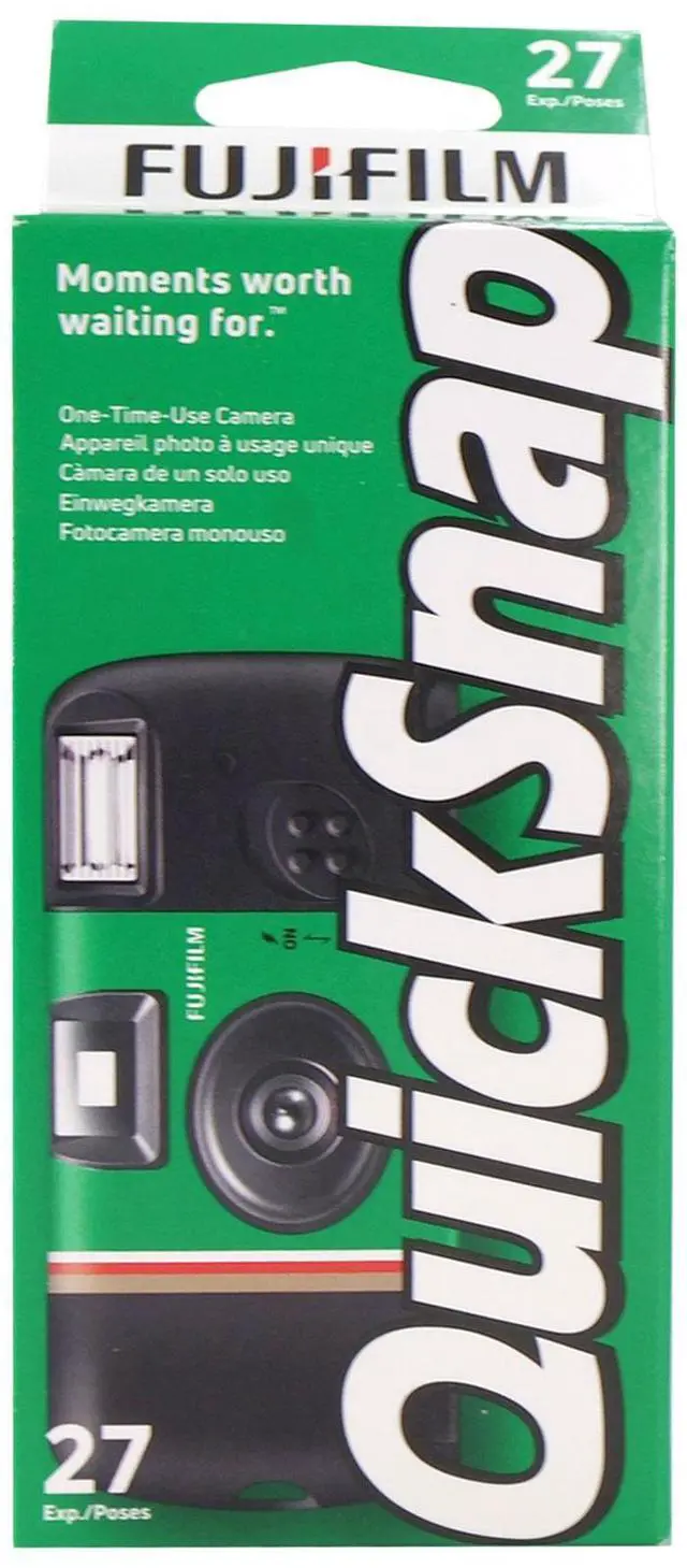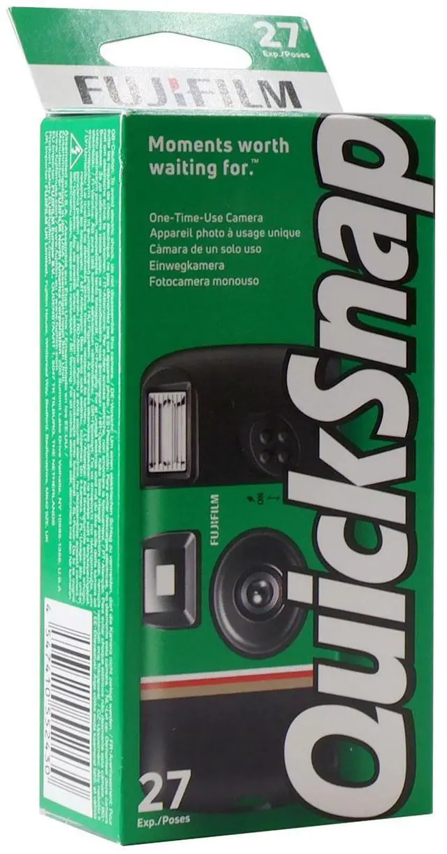 FUJIFILM QuickSnap Flash 400 One-Time-Use Disposable Camera (27 Exposures) A convenient one-time-use disposable camera for both indoor and outdoor shooting situations, the QuickSnap Flash 400 from FUJIFILM is loaded with a roll of 27-exposure Fujicolor Superia X-TRA 400 color negative film for bright, vivid results in a variety of lighting conditions. The compact, portable camera design incorporates a fixed-focus, wide-angle lens, and a matching optical viewfinder for making accurate compositions. Additionally, for image-making in low-light conditions, a built-in flash with a 10' range is featured. It offers automatic recharging, continuous flash operation, and manual on/off control.