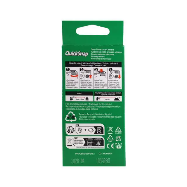 FUJIFILM QuickSnap Flash 400 One-Time-Use Disposable Camera (27 Exposures) A convenient one-time-use disposable camera for both indoor and outdoor shooting situations, the QuickSnap Flash 400 from FUJIFILM is loaded with a roll of 27-exposure Fujicolor Superia X-TRA 400 color negative film for bright, vivid results in a variety of lighting conditions. The compact, portable camera design incorporates a fixed-focus, wide-angle lens, and a matching optical viewfinder for making accurate compositions. Additionally, for image-making in low-light conditions, a built-in flash with a 10' range is featured. It offers automatic recharging, continuous flash operation, and manual on/off control.