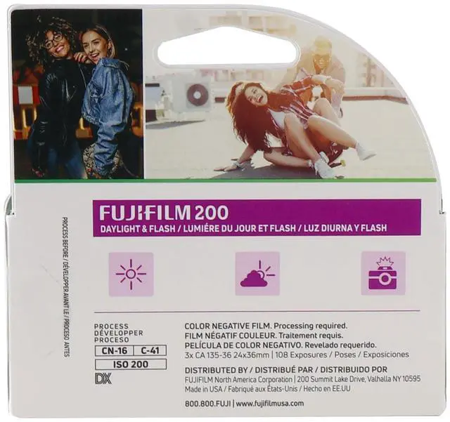 FUJIFILM 200 Color Negative Film (35mm Roll Film, 36 Exposures, 3-Pack) FUJIFILM 200 Color Negative Film is a medium-speed, daylight-balanced film offering a vivid color palette and excellent sharpness. It features a nominal sensitivity of ISO 200/24° along with a wide exposure latitude for use in a variety of lighting conditions. The film produces natural skin tones for portraits and group settings, and its fine-grain structure enables high-quality results for prints and enlargements.
